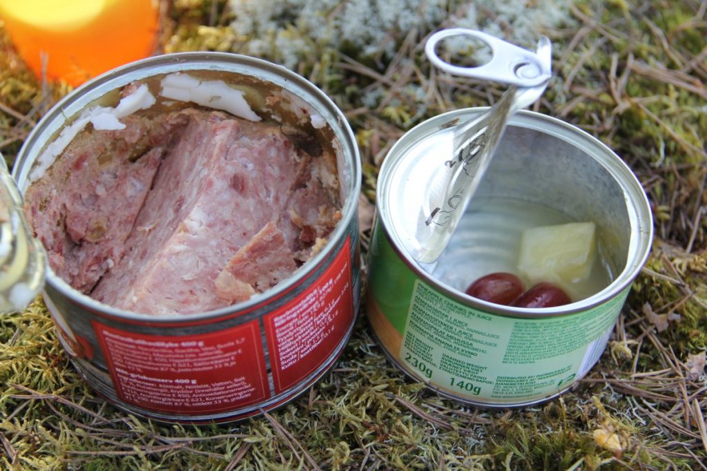 Pian kaikki istuivat luolan lämpimällä, pehmeällä lattialla. Ensin avattiin säilykelihatölkki ja syötiin mehukkaat, makeat viipaleet suoraan tölkistä. Tämän jälkeen tuntui kuitenkin vielä olevan vähän nälkä, ja siksi avattiin pari sardiinirasiaa, jotka syötiin keksien kanssa. Se oli tukeva ateria.(Enid Blyton; Viisikko karkuteillä)