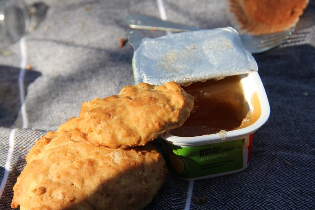 Turhia viivyttelemättä levitimme piknikliinat lohkareiden päälle ja purimme eväät esille.