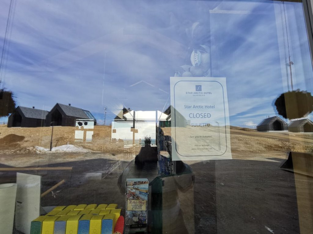 Saariselän kylällä oli aivan kuollutta. Hotelleissa ja ravintoloissa oli laput ovilla, matkailupalveluyrittäjät olivat sulkeneet ovensa ja jopa Saariselän kelohonkainen kappeli oli lukossa ”due to Covid19”. Jokainen koronakevään elänyt tietää, mitä tuo outo sana-kirjain-yhdistelmä tarkoittaa. Olimme tietysti varautuneet tähän lähtiessämme lomalle, olivathan tiukimmat koronarajoitukset vasta ihan äsken hellittäneet. Mutta että ihan kaikki! Kylpylä oli kiinni, Angry Birds -puisto oli kiinni, Metsähallituksen asiakaspalvelupiste oli kiinni, kanootteja ja maastopyöriä vuokraavat yritykset olivat kiinni… Ja pahinta kaikesta: myös luonto- ja patikointipolkujen kerrottiin olevan kiinni siinä mielessä, että lunta oli vielä niin paljon, ettei niille päässyt jalkaisin, mutta kuitenkin niin vähän, ettei hiihtäminenkään enää onnistunut.