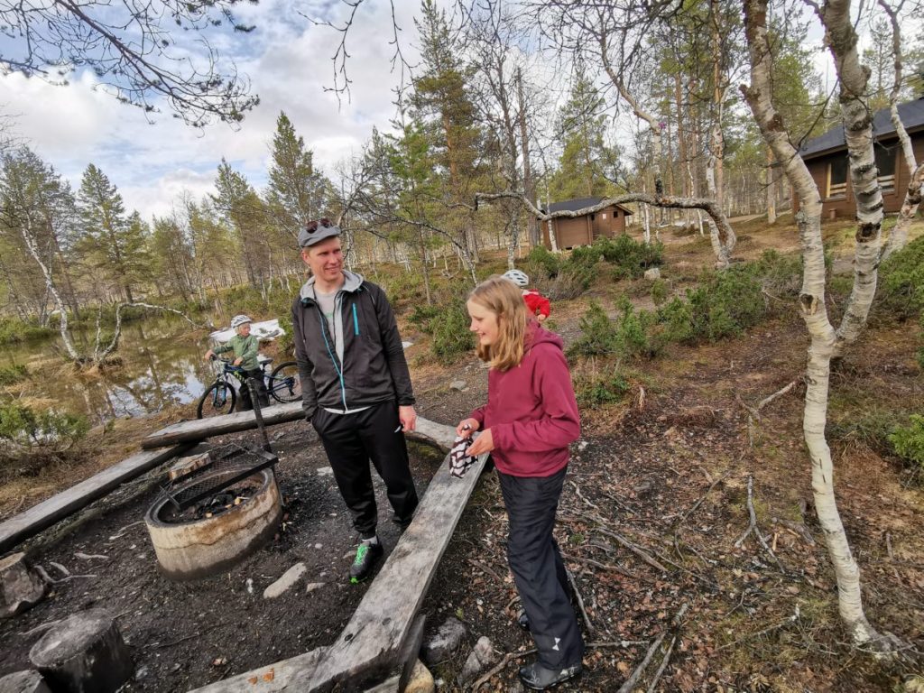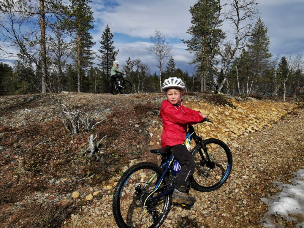 Vaikka matkailupalveluyrityksillä on laput luukulla ja nettisivujenkin perusteella näyttää, että liike on kiinni, useissa yrityksissä on silti väkeä paikalla. Kesäkausi on alkamassa ja siihen pitää tietysti valmistautua. Kysele kaupan kassalta, Holiday Clubin vastaanotosta tai ohikulkijoilta, mistä voisi mahdollisesti vuokrata välineitä, ja jokin yritys varmasti löytyy. Meitä palveli erittäin hienosti Lapin Luontolomat, joka avasi ovensa ihan meitä varten useamman kerran lomaviikon aikana. Maastopyörä aikuiselle kustansi 38 euroa ja lapselle 25 euroa/vuorokausi.