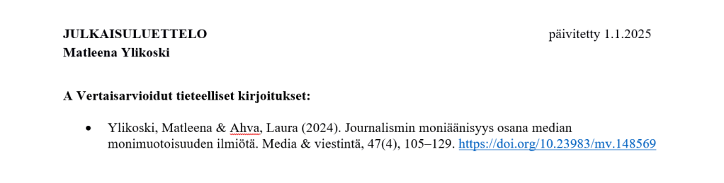 Kyse on tietysti ensimmäisestä oikeasta tutkimusartikkelistani, joka julkaistiin Media & viestintä -lehdessä joulukuussa 2024. Artikkelin otsikko on Journalismin moniäänisyys osana median monimuotoisuuden ilmiötä, ja se löytyy kokonaisuudessaan täältä. Artikkelin julkaisun myötä olen tullut oikeaksi tutkijaksi siinä mielessä, että voin kirjata julkaisuluettelooni ensimmäisen A-luokan julkaisun (kategoria ”vertaisarvioidut tieteelliset kirjoitukset”).